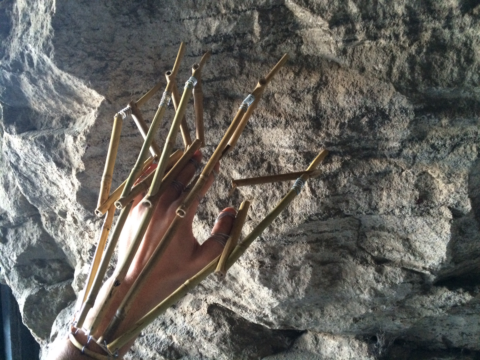 'TACTILITY' augments the users perception of the site via changing how the body comes into contact and understands texture. The skeletal construction of the hand apparatus creates an extension that allows the user to attain an augmented sense of touch. It acts as another hand, preventing direct contact, only able to experience the sense through the apparatus. Springs allow the artificial ‘fingers’ to flex over the surfaces texture, acting as a receptor. These vibrations are transferred down to the spiked ends that touch every finger and thus prick the user. Also as the fingers brush against a surface the user is able to analyse the audio produced. As a result, sense data is attained through an indirect perception of the sites tactile nature, creating a different experience within the site and thus a different means of mapping.